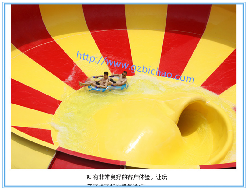 水上樂(lè)園設(shè)備、水上游樂(lè)設(shè)備超級(jí)巨獸碗滑梯又稱旋渦滑梯,占地2000多平方米,游客乘坐皮筏從13.5米高的平臺(tái)口滑下,通過(guò)一段長(zhǎng)達(dá)幾十米的全封閉的管狀滑道之后,會(huì)高速?zèng)_入一個(gè)直徑 15米的巨碗,在離心力的帶動(dòng)下,游客好像在太空中旋轉(zhuǎn)一樣,讓人目眩神迷,最后被吸入碗中間的洞口,游客會(huì)享受到難忘的滑行體驗(yàn),尖叫聲將伴隨滑梯的始終。該水滑梯深受青年人的喜愛(ài),既刺激又好玩。